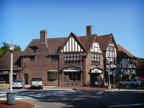 Today we’re travelling over the mountain to one of the metro’s most interesting assets: Mountain Brook Village. Designed in 1929 to complement the new Mountain Brook Estates residential section, it was (like the rest of the new neighborhood) modeled after traditional English architecture and landscape, to convey an aura of timeless, old-moneyed, leisure-class privilege. Of course, such design is also just plain pretty to look at. Unfortunately, the Depression killed most of the planned development both residentially and commercially, and the Village we know today is part 1920’s English Tudor, part 1940’s commercial storefronts, part 1950’s shopping center, and part neo-Tudor from the 1980’s and beyond (thanks to Dystopos for the pic above of one of the original buildings).