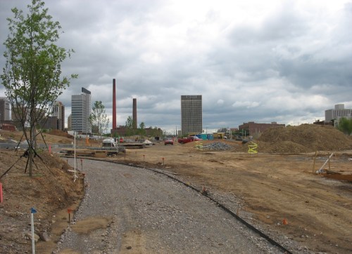 Finally, this last shot I think starts to capture how this new public space can transform how we see the City: we are all familiar with the Daniel Building, and some of us with Cityville housing whose construction is finishing in the next months. Both are a couple blocks away from the park, but just seeing an office building and apartments glimpsed from across undulating hills and trees helps us imagine the new projects that could line the park. There is really no other place in Birmingham that has this sort of potential private-public synergy. This could be the big win we all really need right now.