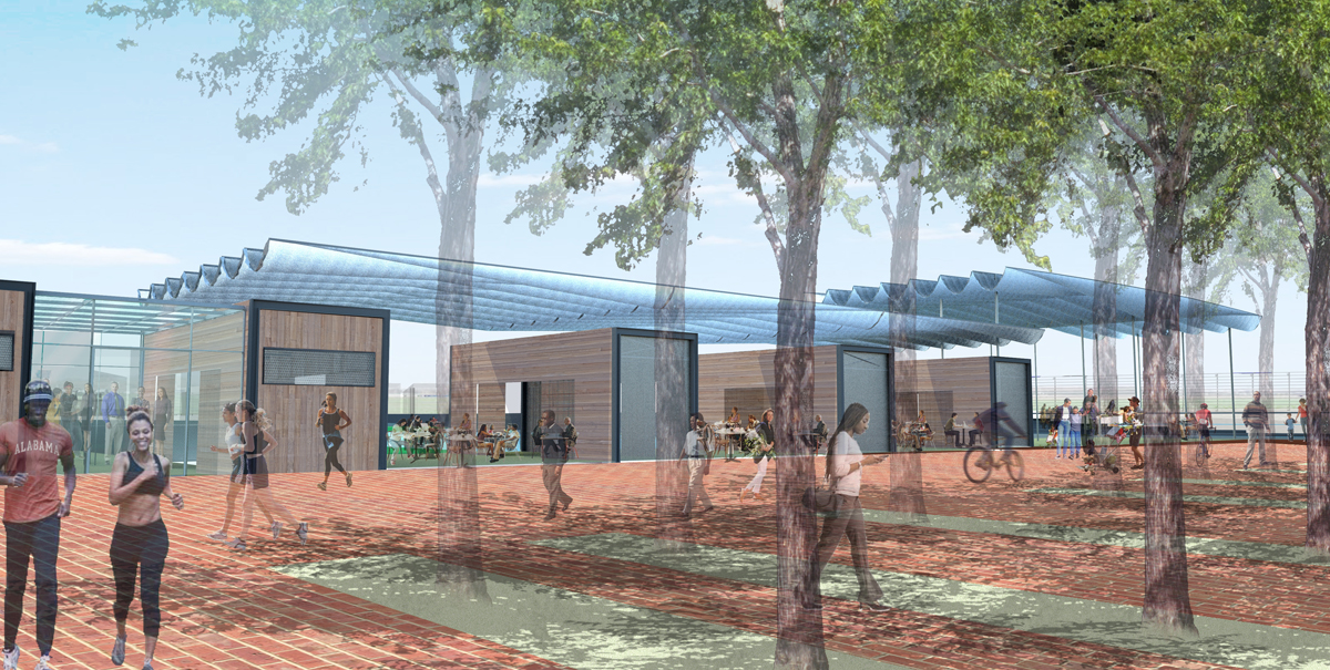 Katherine explained the concessions service: it will be contracted out (they don’t know to whom yet); it will be “upscale” sandwiches and snacks, but at an affordable price point so students can comfortably eat here. There will also be beer and wine on sale–the very idea seems so New Orleans and so not Birmingham, it seems too good to be true. The concessions and other amenities will be housed in boxy pavillions designed to recall old-fashioned box cars, as seen in the below rendering: