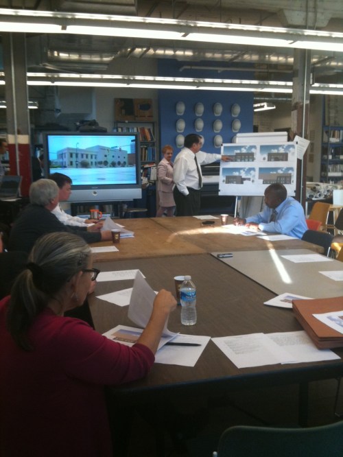 The main concerns came from committee member Cheryl Morgan (pictured above seated at the left during the presentation), who objected to the vaguely classicizing style of the proposed synthetic stucco detailing (pilasters with capitals, cornices, etc.). While the architect (Alan Tichansky of Williams Blackstock) argued that the new design was more stylistically in keeping with the smaller, attached building which is part of the campus, Morgan felt the smaller historic building would be more respected if the new design were simpler, not so overtly “historicist”, and had closer attention paid to proportions and details. In the end, the committee voted to approve as long as the architect just tweaked the capital details.