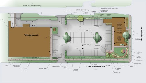 UPDATE: the Walgreens developer Connolly Net Lease and the local architect Blackmon Rogers have sent us the current site plan and Clairmont Avenue renderings (note Henry Sprott Long is located about 6′ to the left, or west, of the drugstore and about halfway back).