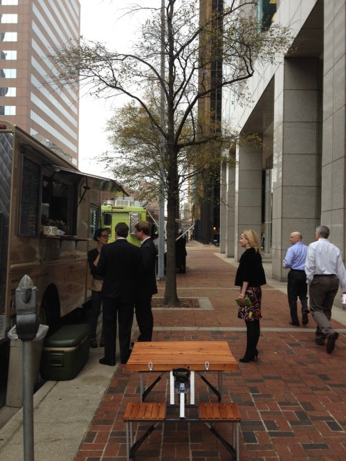 A rainy lunch hour didn’t deter the food trucks from serving eager customers in the downtown CBD today. Above is the Shindigs Catering truck, which has become a favorite across town (grilled prosciutto and fontina  sandwich was fantastic). We appreciated the pop-up picnic tables, some of which were arranged under the covered portico at Wells Fargo on this stretch of sidewalk.
