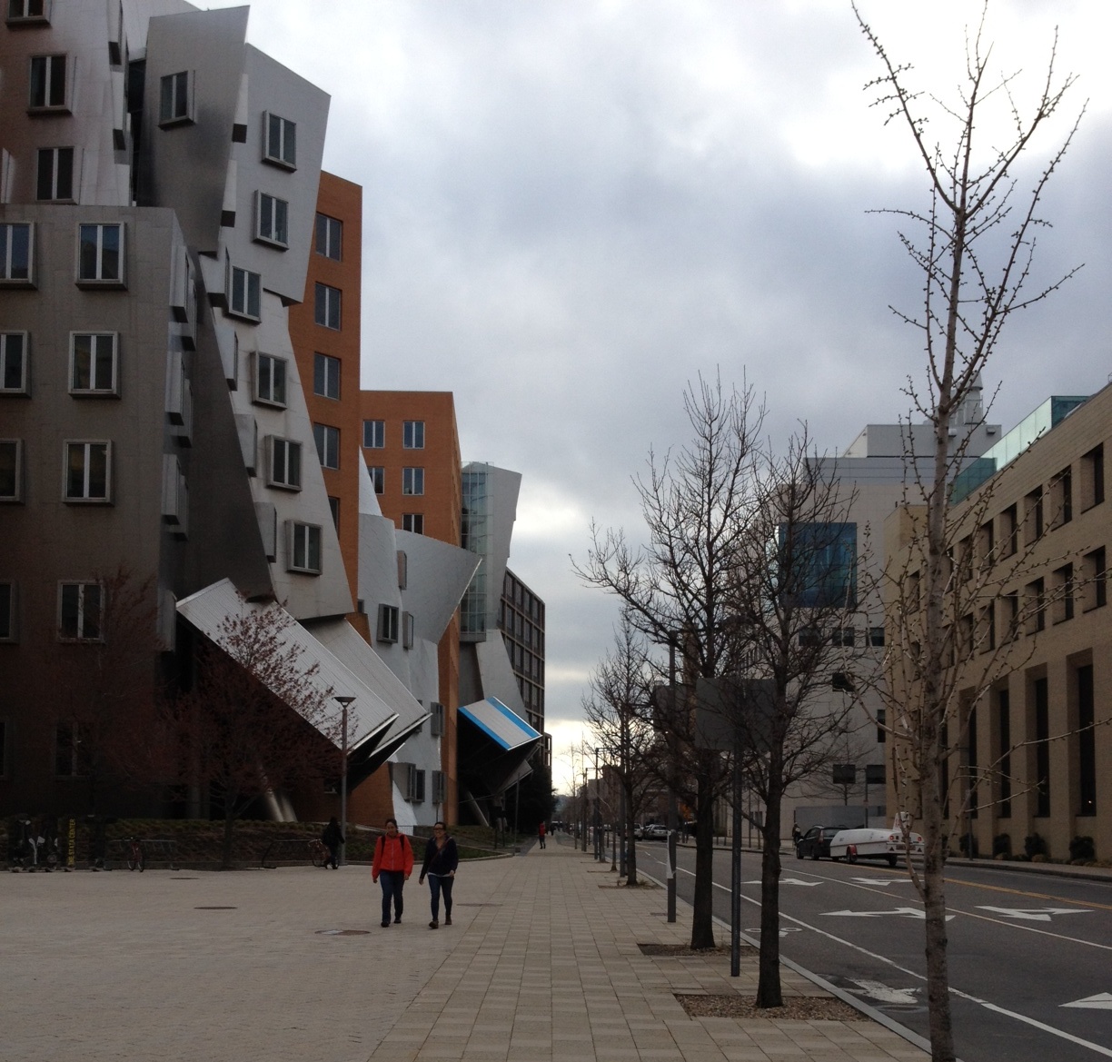 After several weeks of travel, it’s back to Birmingham for a while. This post shares some images from last week’s trip to Boston–to get us all thinking and inspired. Above is Vassar Street in Cambridge, which runs through MIT‘s campus. MIT’s Stata Center (designed by Frank Gehry) is to the left. Subject to lawsuits and other controversy, it was a bold effort on the part of the university to bring more notable architecture to the campus. Vassar, and other streets, have been improved with wide sidewalks, bike lanes (sometimes in the road bed as shown above, sometimes integrated into super-wide sidewalks), and planting that makes a pleasant walking or biking environment.