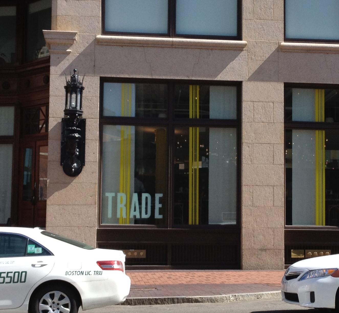 Back downtown, the above restaurant Trade was spotted: kudos for the arresting graphic including bright yellow stripes. The graphic sensibility of Boston is generally subdued, so this one stood out.