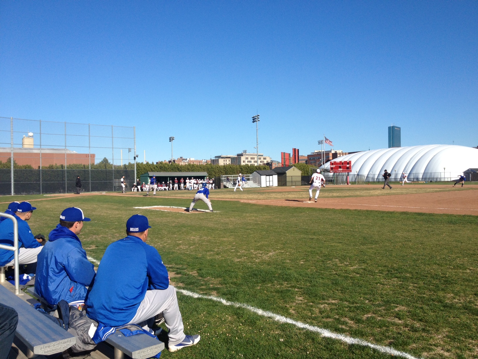 The pedestrian experience is enhanced by playing fields easily accessed from the street, where an MIT-Coast Guard Academy game was observed, above. The Hancock Tower in the Back Bay area across the river is visible to the right.