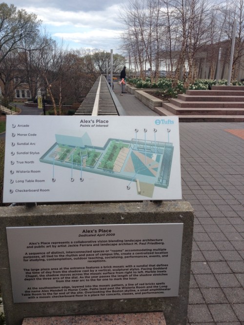 2. Thanks for the beantown post, Bham. I was intrigued by “Alex’s place” and the sign that describes how and what, but not why. A little more on Alex here: http://www.tuftsdaily.com/library-roof-officially-unveiled-as-alex-s-place-1.1734508. Maybe it would have been okay to let some of that emotion into the wayfinding system?