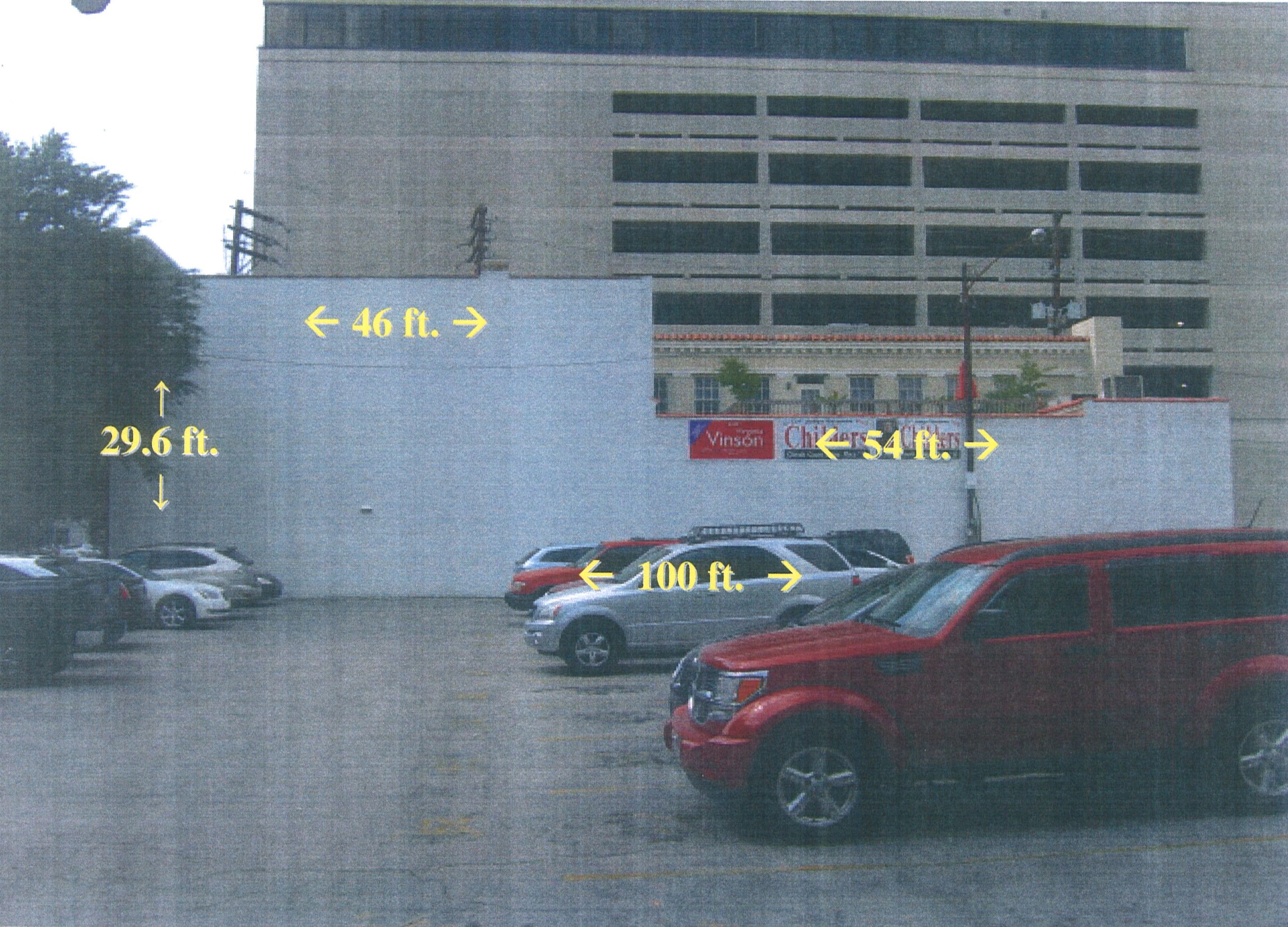 For years, the historic Redmont Hotel has faced the gloomy existing condition (above), where an ugly surface parking lot allows the view to the blank side wall. This mural–besides increasing everyone’s anticipation of the Barons returning to the central city–will be a welcome improvement to this downtown corner. And a more pleasant introduction to the urban environment to anyone exiting the hotel lobby.