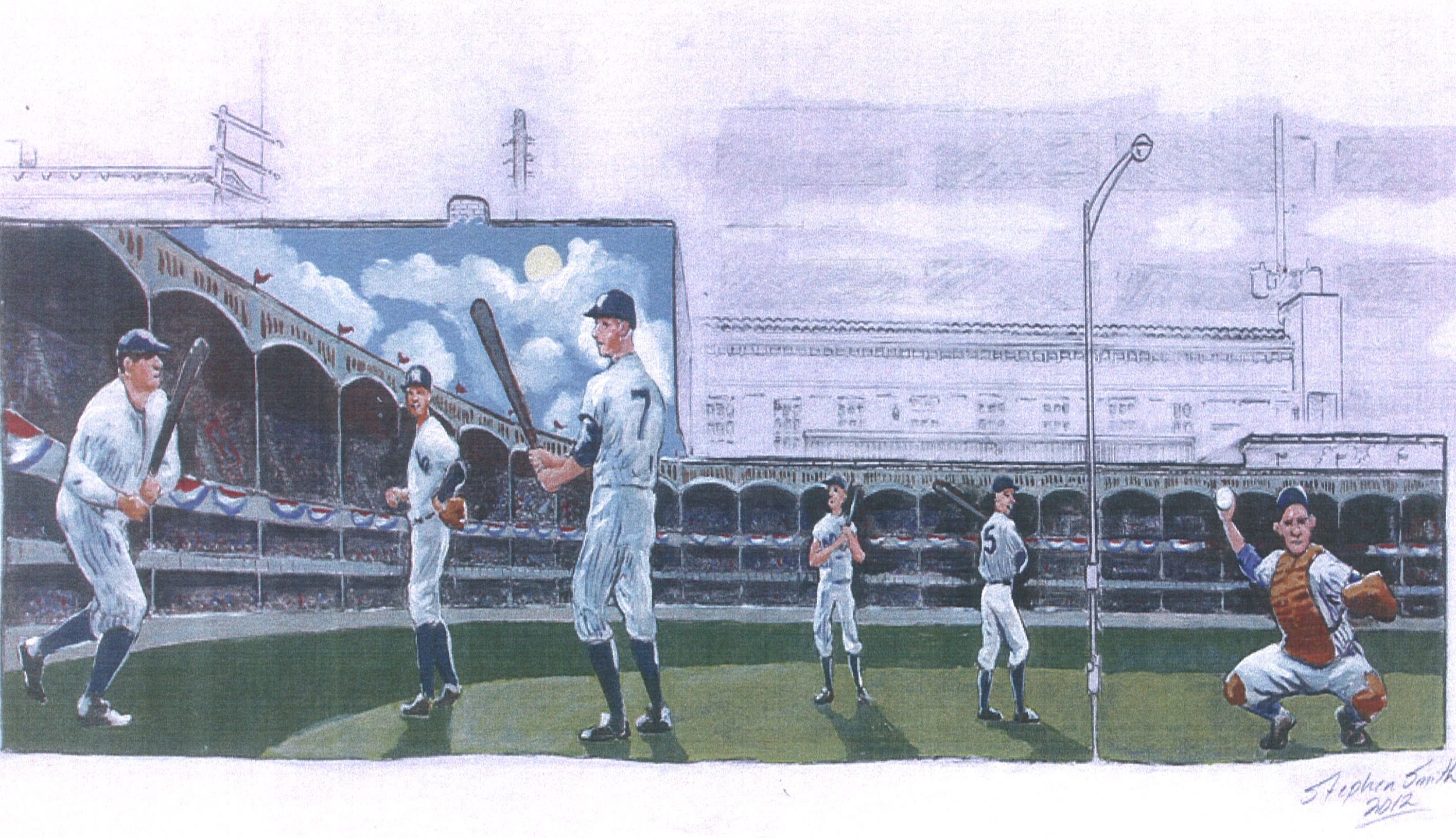 8. OK — The Babe, Joe D, the Mick, Yogi, and without numbers, probably Lou Gehrig, but who is the pitcher — Whitey Ford?