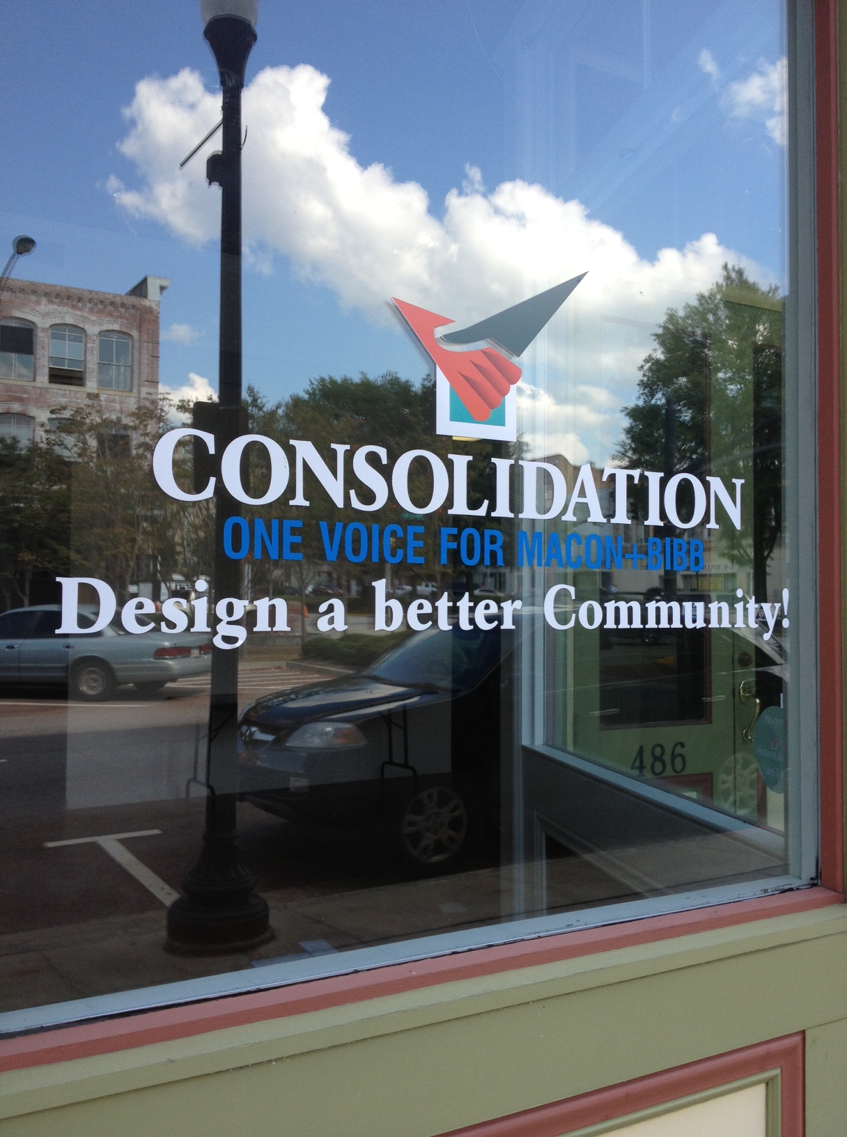 Spotted around the corner from Terminal Station was this storefront above, former headquarters of the consolidation movement which, just a few months ago, resulted in the citizens of Macon and surrounding Bibb County voting to merge as one entity. With the City and County speaking with one voice, it will make it easier to lobby for that train service, as well as any number of other initiatives. The politics, economics and demographics are different in Bibb County compared to Jefferson County; but it must be said that we are held back from achieving our true potential because our region doesn’t speak with that one voice. We waste too much time arguing amongst ourselves instead–rather than uniting for high-speed rail. Or a functioning transit system.