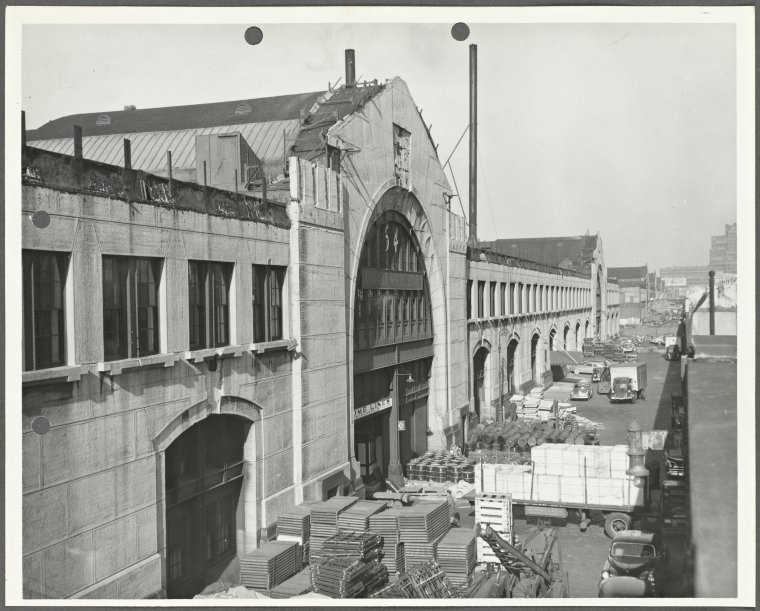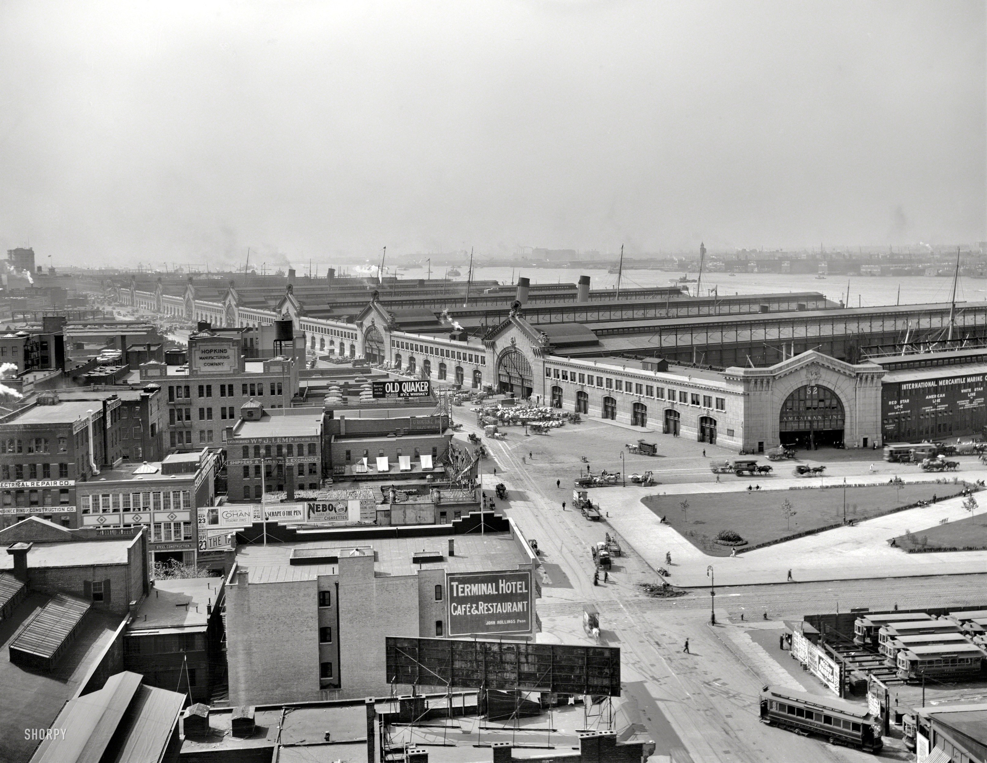 Above is a shot of the Chelsea Piers in their heyday of 1920, looking south along 11th Avenue with the Hudson River in the background. Designed by Warren and Whetmore, the architect of Grand Central Terminal, it opened in 1910 and the handsome granite facade stretched many blocks to accommodate the biggest passenger ships of the day. Note the large arched openings, of which the Pier 54 skeleton is a remnant.