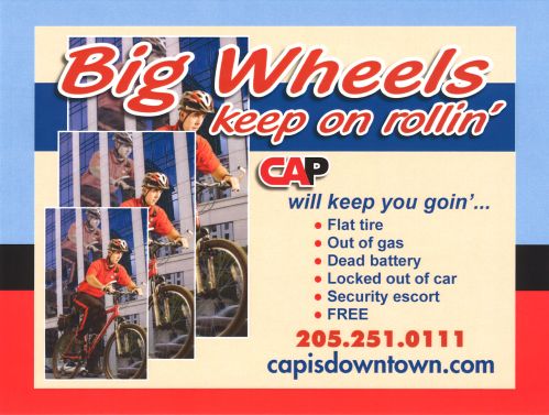 First, a couple items that were denied at Design Review Committee last week. The above is a proposed 15 x 20 foot banner (that’s big) to be located on the alley elevation of John’s City Diner on Richard Arrington Blvd. North, advertising the services of City Action Partnership, or CAP. This great organization provides supplemental security and motorist assistance to downtowners–and has certainly been instrumental in making the downtown core one of the safest neighborhoods in the metro. Advantage Marketing presented this design to advertise CAP–but it was sent back to the drawing board for being too incoherent for the average person to understand. The image is confusing; the “Big Wheels” seems to be advertising something else altogether; the font sizes aren’t balanced, etc. CAP does too great a public service; it deserves better design to communicate their mission. And the public deserves something much better to look at.