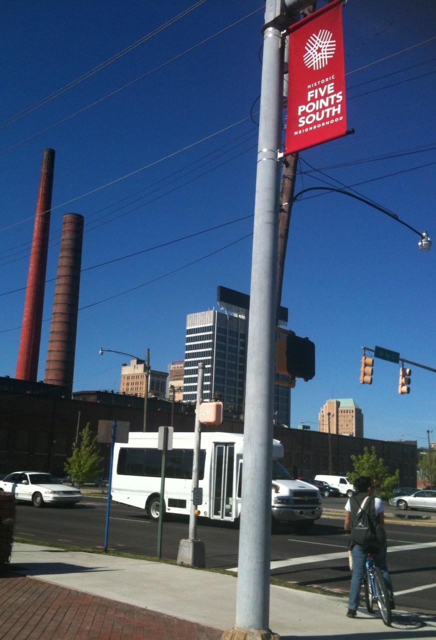 A different kind of mismatch is found at the approach to Railroad Park, where recently banners announcing the Five Points South neighborhood went up. Yes, the Five Points neighborhood stretches all the way north to the railroad tracks. But as a tourist destination and mental construct, Five Points is the area directly around Five Points Circle. It is confusing to say the least, to see these banners when one leaves the new Railroad Park–whose immediate neighborhood has already been envisioned as a distinct entity for redevelopment and marketing purposes (tentatively called Parkside). Showing these banners a dozen blocks away from Five Points Circle is not the right way to go. We should be developing a final name and logo for Parkside (contest, anyone?) and putting those banners up. They can even say in smaller print “part of the greater Five Points Neighborhood” if necessary. Of all areas, this location needs more focused branding, not territorial marking. The money for Five Points banners should be spent on kiosks or other needed items near the Circle itself.