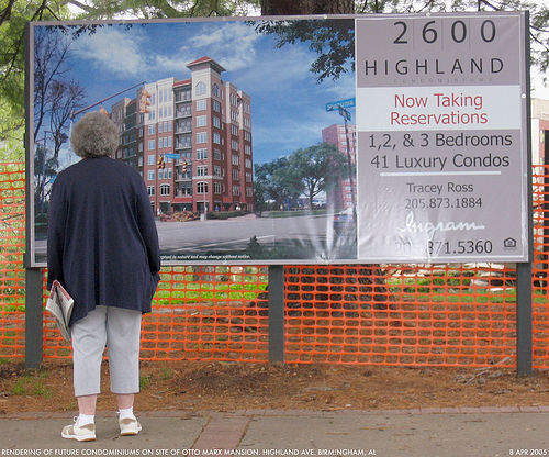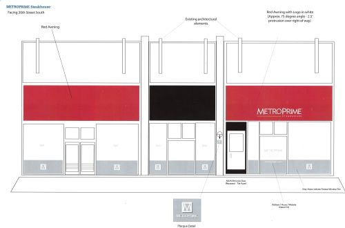 About a year ago we posted on the unfortunate deterioration of an aging strip center in Five Points South at the corner of 19th Street and 11th Avenue South. A massive “Bail Bonds” sign that had gone up without Design Review permission seemed to symbolize the challenges of this historic commercial area’s struggle to rejuvenate. This morning, the above proposal was unanimously passed by the Committee. All existing (and mainly non-conforming) signage will be removed, and a new red sign band created to provide a unified appearance. Needless to say, there was practically cheering in the aisles. (Cohen, Carnaggio, Reynolds are the architects).