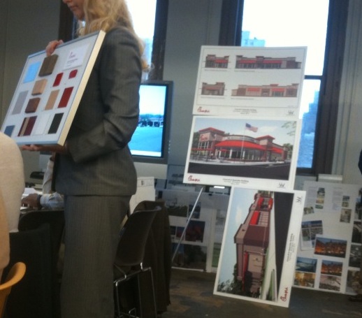 What ensued was a somewhat circular discussion, with Design Review members Mauk, Cosper, Cheryl Morgan, and Mark Fugnitto continually reminding Chick-Fil-A about the importance of neighborhood, pedestrians, and context, and Chick-Fil-A appearing a bit caught off -guard (again, despite the appeal process they’ve just been through). The company has now hired an outside design consultant (architect Bill Allswell–I’m afraid I’m not spelling his name correctly). This architect also presented two proposed exterior elevations, one which he admitted was “more suburban” and one which was “more contextual”. Neither was aesthetically very pleasing, though each tried to extend the mass of the actual building with some false screen walls.