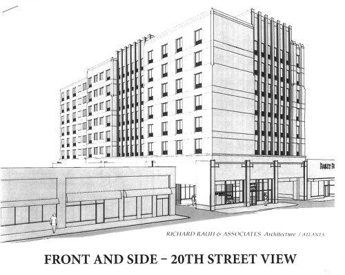 Also presented this morning was the long-awaited Homewood Suites hotel project (architect Richard Rauh above) which has already broken ground; it too was coming for final material approval. If you look closely at the image above, you’ll see a diagram on the screen of every piece of the historic ground floor facade (formerly Five Points Music Hall and Piggly Wiggly) documented for a meticulous replication. The original Art Deco facade was found close to collapse during demolition and could not be saved; the developer will now reproduce it. A synthetic stucco material was rejected by the Committee; the developer will return most likely with true limestone for this portion (the remainder of the eight story Art Deco-style building will be brick and stucco).