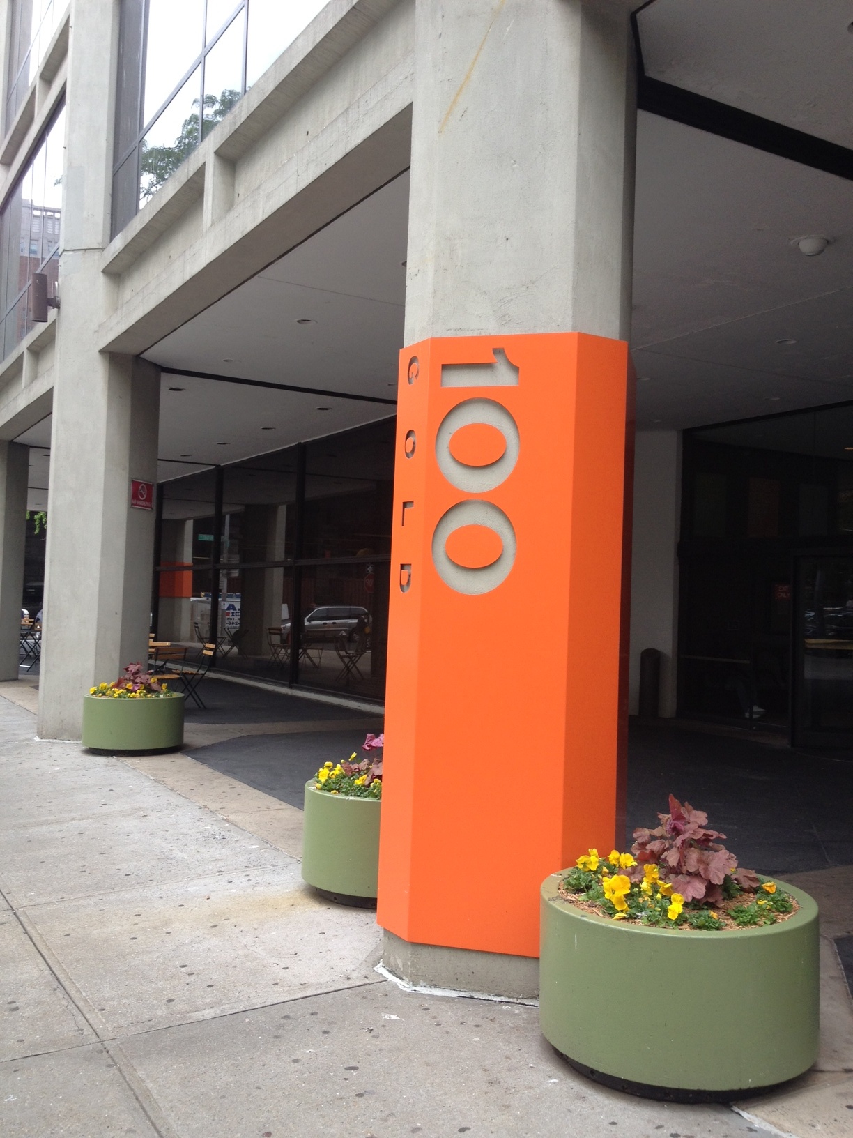 While Goldman Sachs famously has no corporate logos or company signage of any kind on its building–even the security guards wear anonymous black suits–100 Gold street, a bland 1970’s building a few blocks away, had an image problem. The wrapped address signage (above) does a good job announcing the building to the public, without distracting from the lines of the original design. This is a simple, but sophisticated addition.