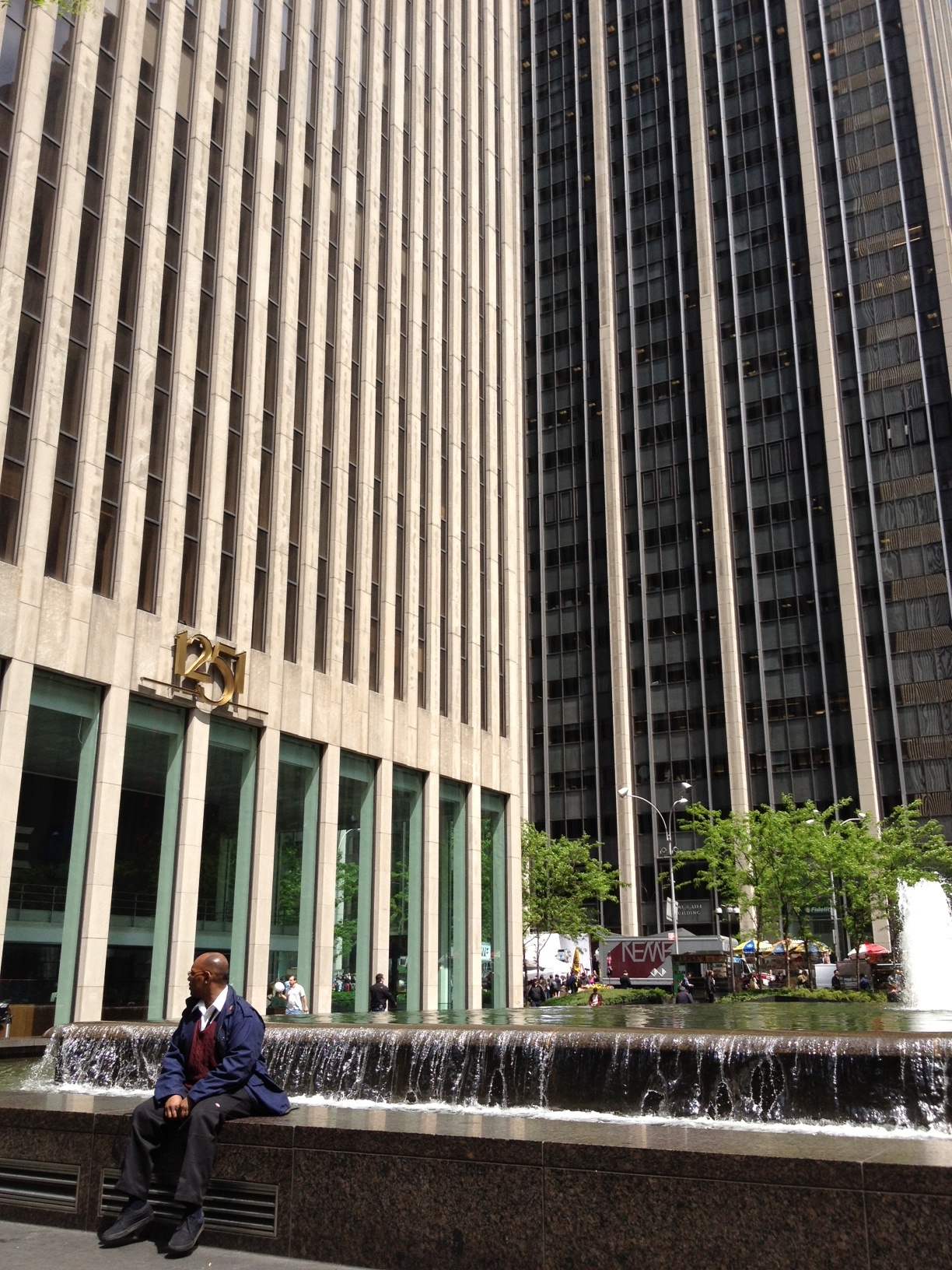 The more well-known midtown includes 6th Avenue (above, at 49th Street) where massive towers were set back from the street back in the 1960’s as a result of new zoning laws that allowed greater heights if the developer provided “public space” along the street. The famously bleak, wind-swept plazas that resulted were, at least in the location above, a little less bleak due to fountains, benches, and landscaping making the best of a very anti-urban condition.