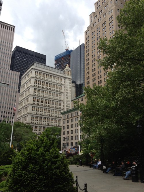 Partly as a result of the influx of new residents, the area’s parks have been renovated: people from neighborhoods further north flock south with their kids to enjoy the Financial District–an activity that would have been unheard of 10 years ago. Above is City Hall Park, which at 9 AM Thursday was filled with office workers, mothers with strollers (and a few nannies), and tourists.