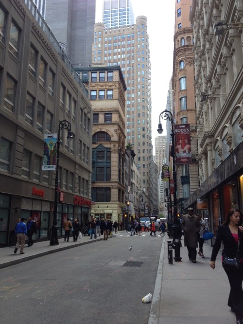 Compared to the relatively new (1811) street grid further north, the older street pattern in this neighborhood is full of curves and diagonals, with narrow roadbed widths (above is Fulton Street looking east from Nassau Street). This tends to confine auto traffic to certain widened arteries, with pedestrians often having free reign in the streets retaining original dimensions.