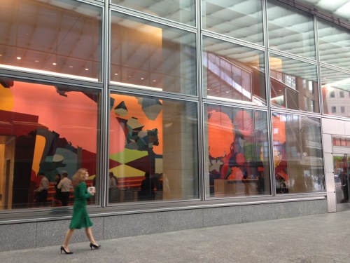 Across from the new One World Trade Center is 200 West Street, the global headquarters for Goldman Sachs. Choosing this location in part to demonstrate strong commitment to the World Trade Center area after the tragedy, the 43-story building opened in 2009 and was designed by Pei Cobb Fried with other design firms handling different portions of the interiors. Huge murals were commissioned for the numerous lobby spaces, designed for the enjoyment of passerby, including “Sunrise, Sunset” by Franz Ackerman above (you can read a New Yorker review of 200 West here).