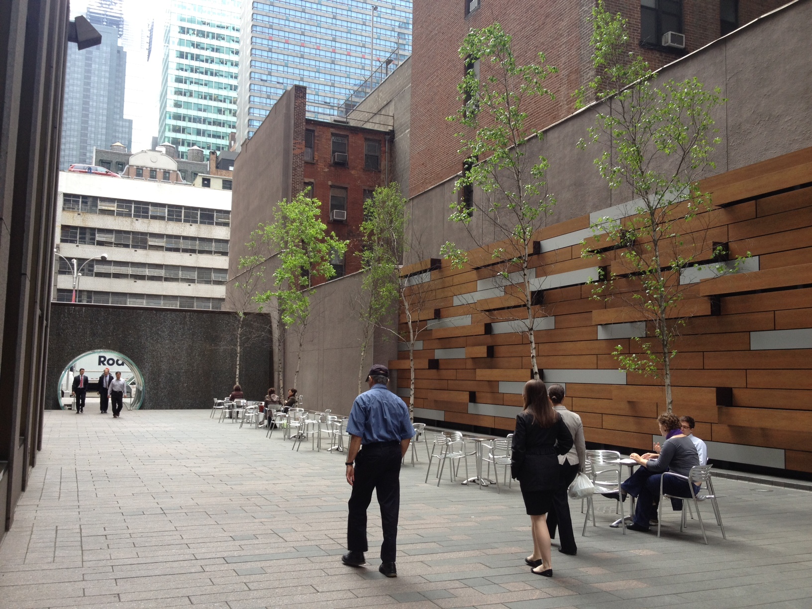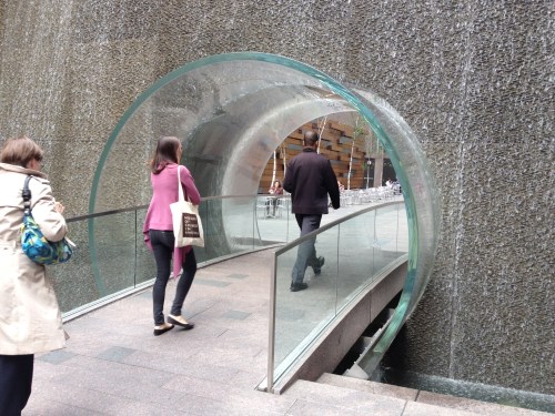 Above is the entrance to this pocket park from 48th Street–sort of Chinese garden gateway reinterpreted. You pass under a thick transparent tube inserted through a concrete wall with water rushing down the full length of the wall, splashing the ceiling above you, and falling into a trough below. It’s a wonderful effect–you really feel like you’re passing from one realm into another. The expense of this sort of feature makes one reflect on the “only in New York” budgets these spaces can have.