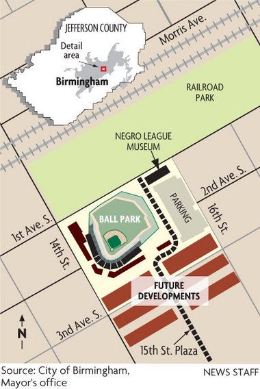 The Birmingham News ran a story yesterday which pinpoints the proposed location of the new Barons Ballpark (see News graphic above). The facility itself would be entered from 14th Street or a 15th Street Plaza, with stands arranged on the SW corner of the site facing the downtown skyline. The outfield faces Railroad Park from across First Avenue South. Ancillary structures (assumedly patron and team amenities/facilities) and a Negro League Museum flank the ballpark along First Avenue; “future developments”, i.e. related private investments, are shown on property to the south.