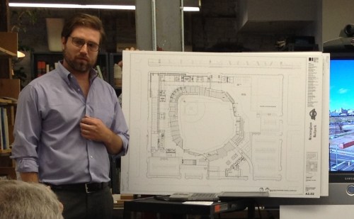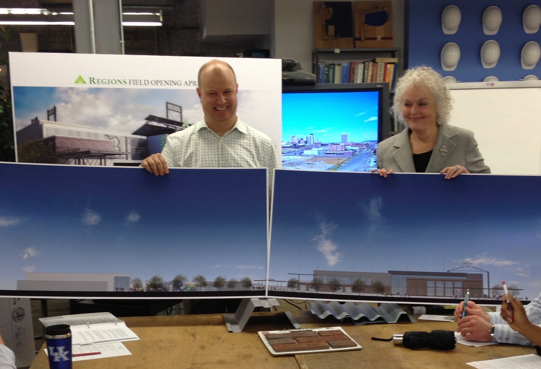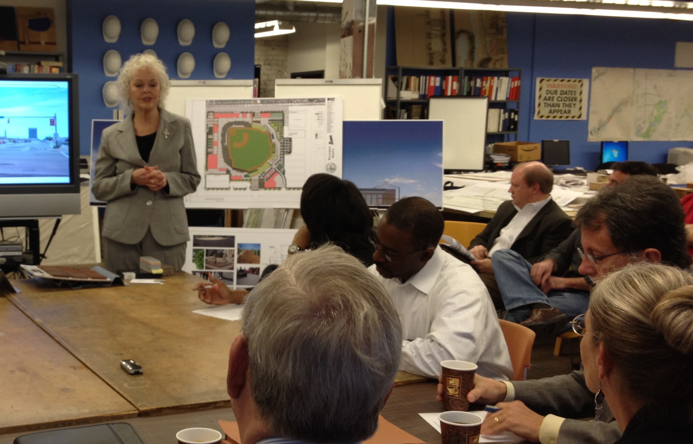 This morning’s Design Review Committee unanimously approved building and landscape design for Regions Field, the new downtown home of the Birmingham Barons baseball team (above, Virginia Williams with the Mayor’s office introduces the project).  Looking closely at the colored plan on the easel above, you can see the baseball diamond oriented for optimum home plate and spectator comfort (shade will fall across the stands at almost all times). In pink are the ancillary elements along the 1st Avenue South edge up top and the 14th Street edge to the left; their character was the subject of most of the Committee’s discussion.
