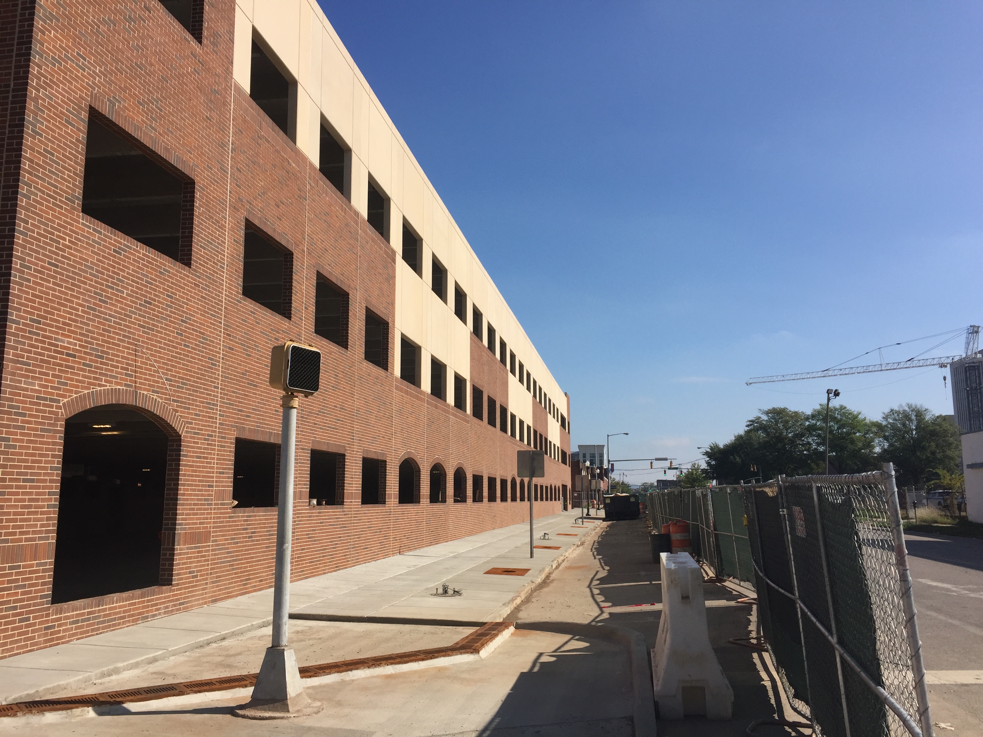 Along 18th Street South and Second Avenue, Healthcare Realty Trust, the REIT which owns a building directly north, is constructing a parking deck on a former surface parking lot (above, looking east along Second Avenue). There is not much to say here, except that there’s no attempt at an architectural fig leaf: we get a stark, block-long wall of brick, with smallish pierced openings looking directly into the garage. That this is being built a half block from Railroad Park is pretty devastating. Zoning laws in the City should be amended to require any parking deck constructed in prominent urban places to contain ground floor retail or other components to enhance the adjacent public space of the street, rather than cheapen it.