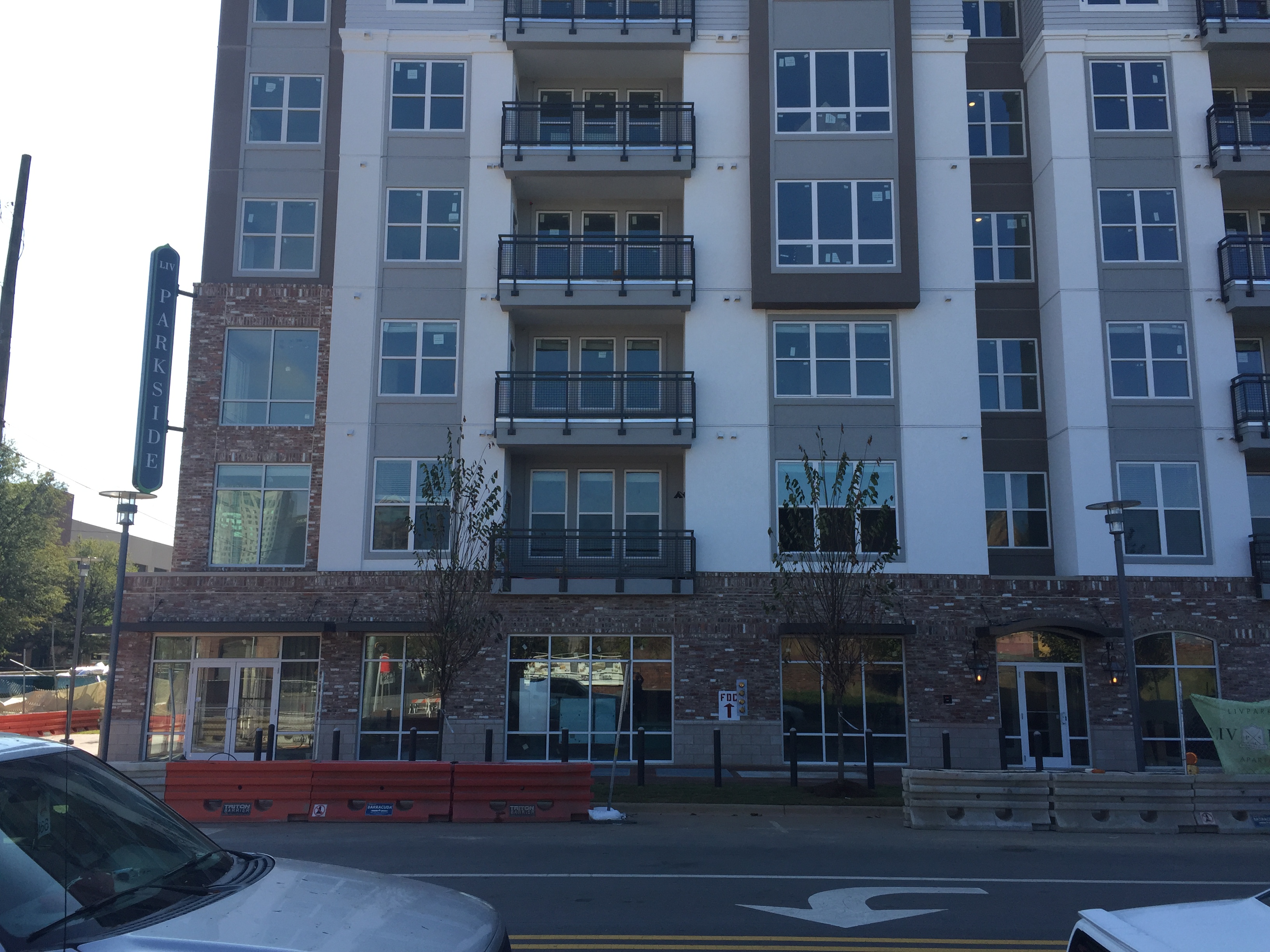 The new Parkside neighborhood taking shape around Railroad Park is promoted as a mixed-use urban neighborhood with plenty of retail, restaurant, and entertainment. It seems basic, but new projects must provide rentable ground floor space to sign up the retail, restaurant and entertainment that attract people to live, visit and stroll the streets. How are some current projects stacking up in this regard? Currently under construction, 20 Midtown is one of the most prominent, retail-wise, in the area (multi-sites along 20th Street South between Second and Fourth Avenues; architect: Cohen Carnaggio Reynolds). The first building’s Starbucks has recently opened (above); a Chipotle is on its way, and a Publix supermarket is coming in 2016. This lineup of national retailers is fairly unprecedented for a single project downtown or midtown. The supermarket alone promises to be a major anchor that will pull other developments into the area.