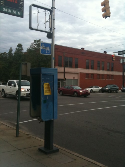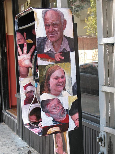The empty phone booth outside the office (2300 block of 2nd Avenue North)–inspiration for an earlier post on phone booth art–was still in the same old, dilapidated and hollowed-out state. But intriguingly, someone had pasted a piece of artwork inside, showing a masked superhero declaring “This City must be saved! And only I can save it!”