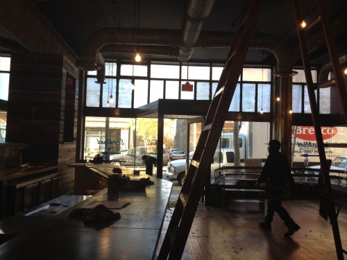 Above is the storefront, in the former Storkland store; you will notice the hostess stand (temporarily outside) made from leftover concrete from a core drill on site, with rebar twisting up to hold the “book”. Design was a collaboration between KDAG Designs and Appleseed Workshop, with Appleseed not just handling general construction, but also custom building many of the interior elements like the stand. Outdoor seating will be installed at the sidewalk.