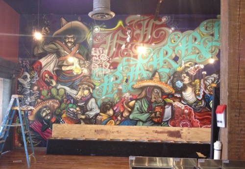 A visually arresting feature of the main room is local artist Shane B’s full-wall mural (above, with a half-built banquette underneath; Shane B can be found at Non Stop Art around the corner on 20th Street). A riff on urban street art, it should set the mood for botanas (Mexican street snacks that are part of the planned menu).