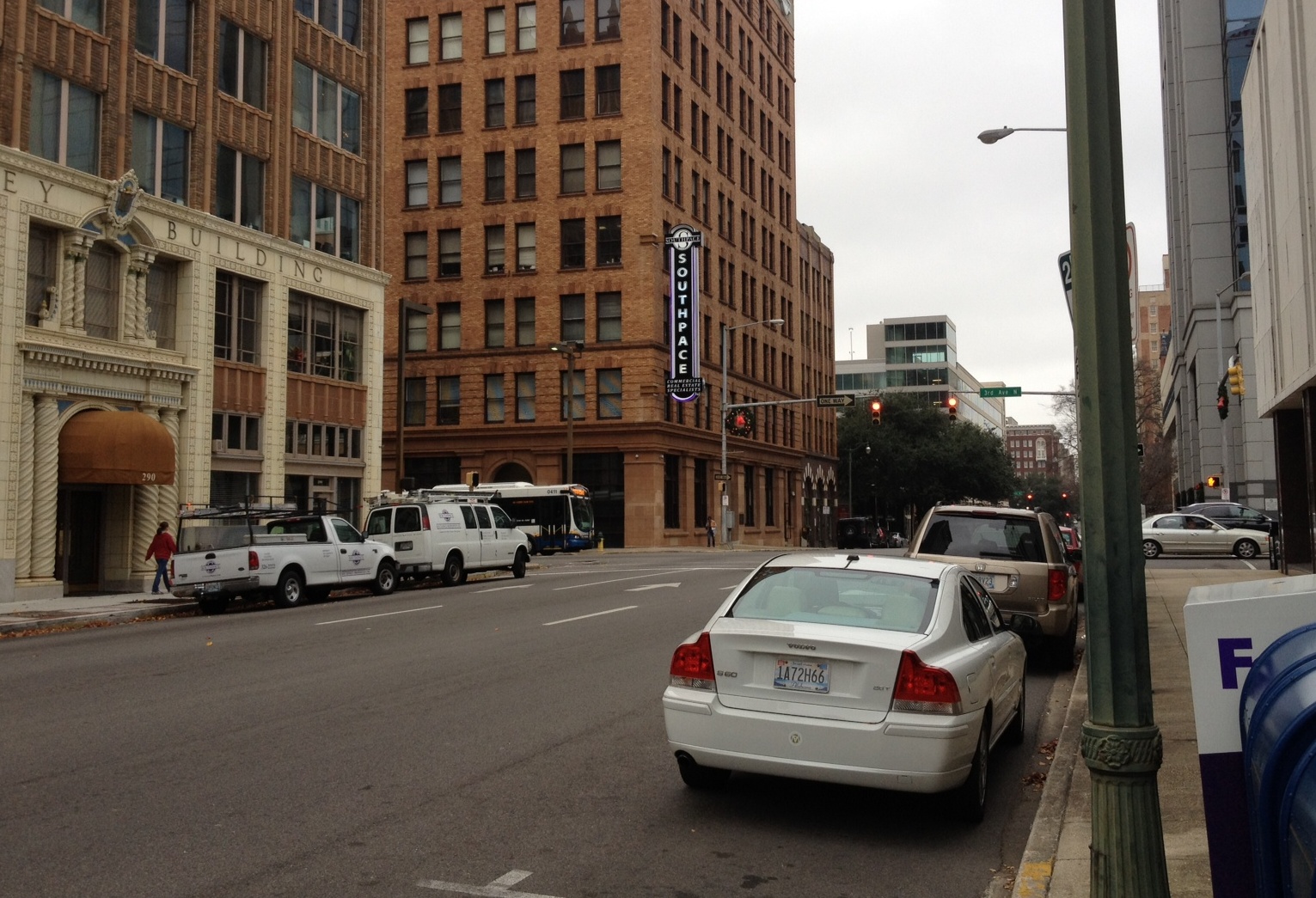 This morning at Design Review Committee, several sign packages were approved. Above is a rendering of the new illuminated, projecting sign for Southpace Properties, the commercial real estate firm located in the historic Title Building at the corner of Richard Arrington Blvd. and 3rd Avenue North. Slogging out of a brutal recession that’s been crippling to the commercial real estate market, this sign is a hopeful indicator that firms like Southpace intend to stick around and that development will continue. The proportion and illumination mimics the original projecting signs installed in the 1920’s on this building; its unanimous approval signals a welcome reversal to the city’s aversion to projecting signs which started in the 1970s (it became fashionable to consider projecting signs old-fashioned and messy). If they’re designed nicely, and proportional, projecting signs are an important part of the urban fabric. Downtowns look blank and forlorn without them.