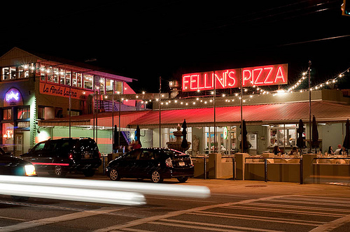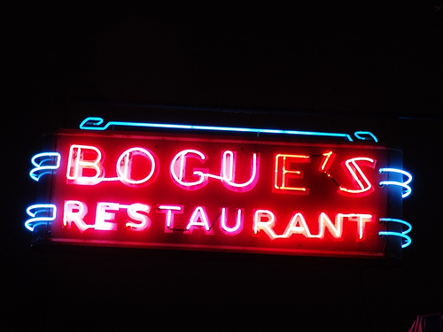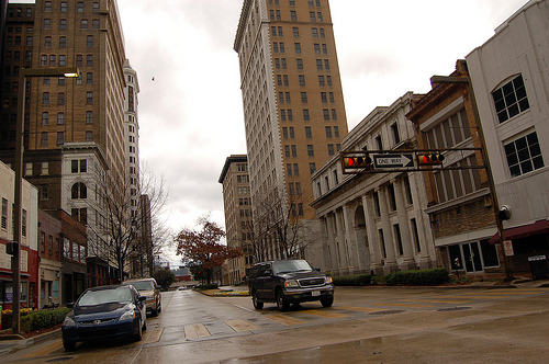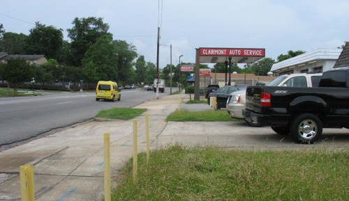 The largest issue here is not the architecture per se (although it’s important), but the site layout itself. Above is Clairmont Avenue, looking west from the Fire Station. Note all the setbacks along the street–except for Bogue’s, whose setback is perhaps 5 feet or so, all structures are placed back 10-30 feet from the front property line. This is due in part to the fact the street was initially laid out residentially, with houses, porches, and apartment buildings. And lawns.