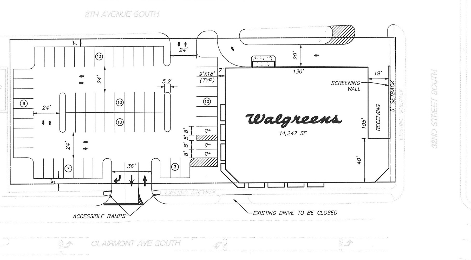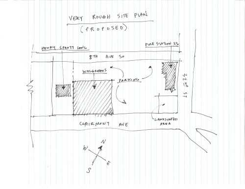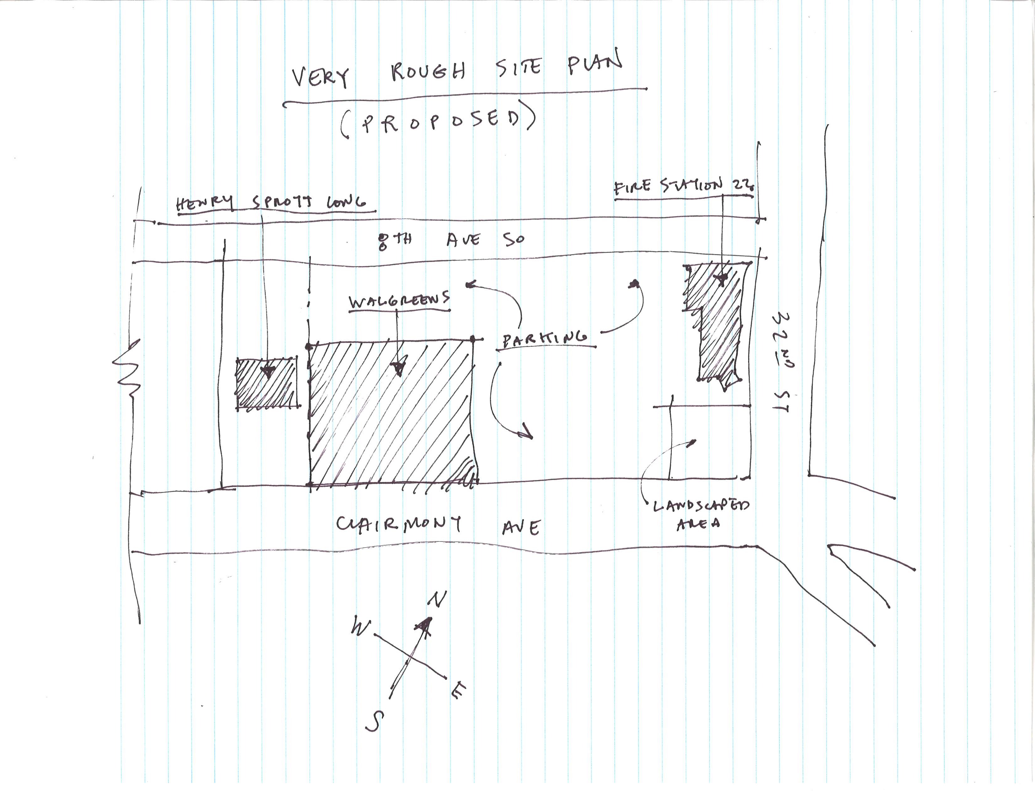 Yesterday Connolly Net Lease, the developer who has acquired the historic Fire Station No. 22 and several adjacent parcels along the 3100 block of Clairmont Avenue South, held a charrette to help determine what a new Walgreens would look like. Coming off of a contentious earlier effort (which involved demolishing the Fire Station), the new plan is at first glance more pleasing to neighbors and others: the Fire Station has been saved, and will house two of the existing businesses that will be demolished on adjacent lots (Bogue’s Restaurant and Triple Platinum Salon). Connolly said the famous Bogue’s neon sign will be preserved and move it to the Fire Station; a neighborhood landmark is preserved and will have two local businesses inside. Good. But what about the plan for the new structure and site layout?