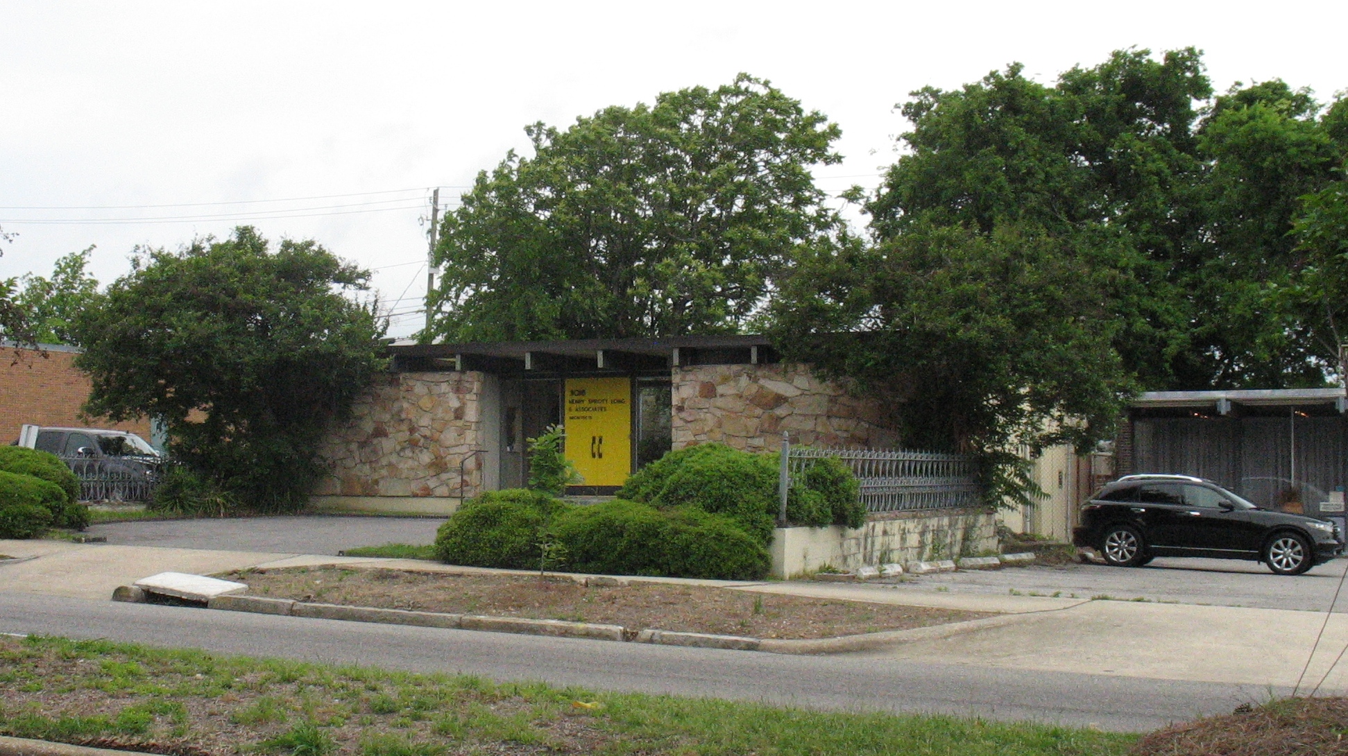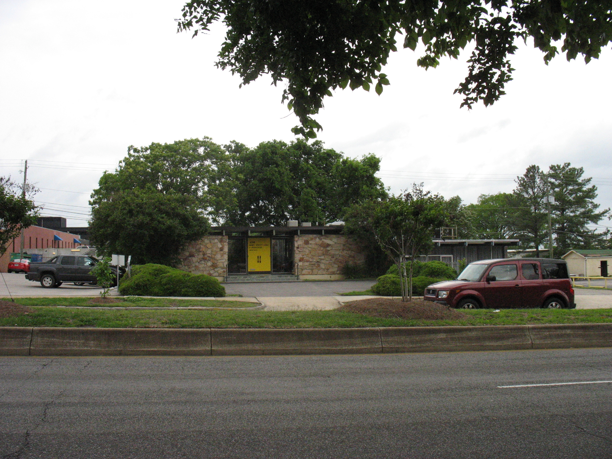About 1960, the architectural firm Henry Sprott Long moved from their downtown offices to the leafier region of Clairmont Avenue, which by that point had become a less desirable residential address. They built an international style gem, with exposed steel beams, plate glass, stone veneer, and a flat roof (above). However, they were careful to respect their residential neighbors, preserving trees, keeping the scale modest–and setting the building back to match the adjacent houses.