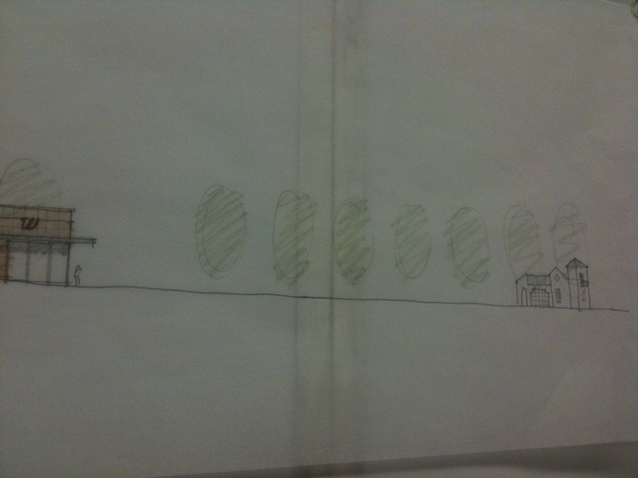 At the design charrette, the principals of Blackmon Rogers Architects showed a site plan that has a +/- 13,500 square foot Walgreens moved all the way to the western edge of the lot, and pulled out to the sidewalk with no setback. This awkwardly hems in Henry Sprott Long. In many cases, the correct “urban” and “pedestrian-friendly” location of a commercial building is right at the sidewalk. In this case, we’re not as sure.