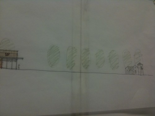 …a large surface parking lot, the extent of which can be seen in the second part of the sketch above (note the diminutive Fire Station to the far right). Having this much surface parking running along Clairmont is not good. If I were to redesign this site, I would place Walgreens more in the center between the international style and Spanish-style historic structures (and yes, they are both historic); I would make it longer and skinnier along Clairmont to put more mass on the street; I would set it back a very modest amount from the sidewalk; and parking would be contained at the rear. As it is, the Fire Station feels marooned in isolation at the end of the sea of parking, and Henry Sprott Long has the opposite problem: it’s being strangled by its much larger new neighbor.